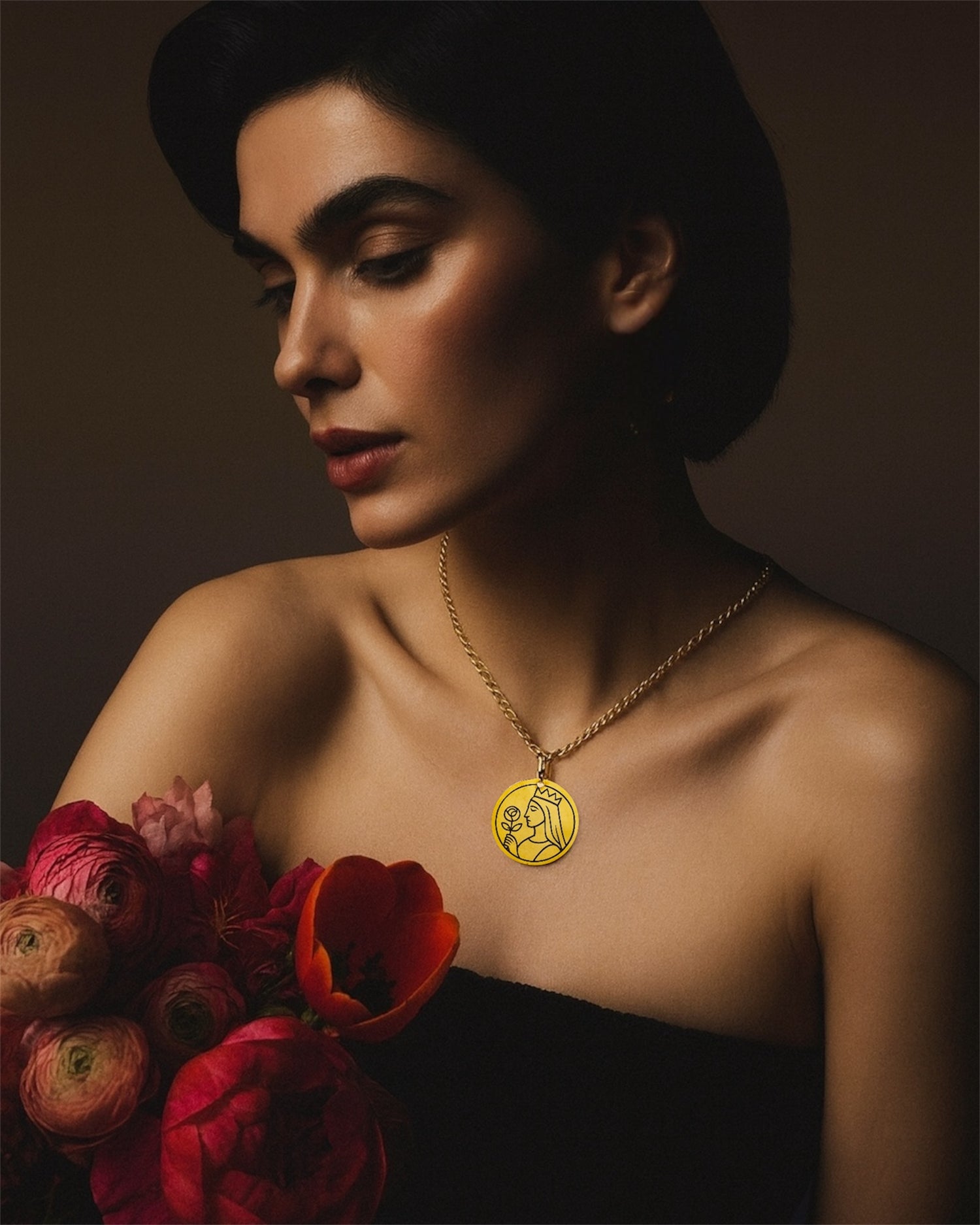 Com detalhes refinados e simbologia única, as peças retratam a delicadeza das rosas e a majestade da coroa, homenageando a sua lendária bondade