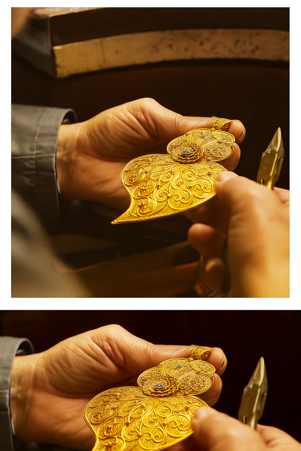 Com detalhes refinados e simbologia única, as peças retratam a delicadeza das rosas e a majestade da coroa, homenageando a sua lendária bondade