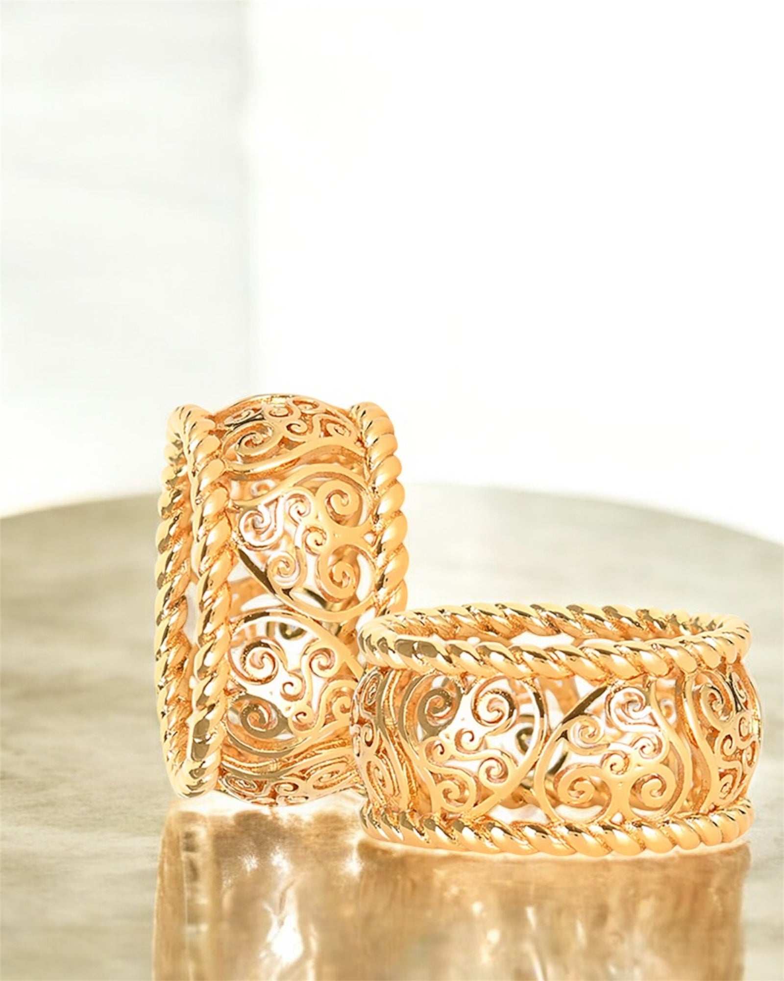 Em filigrana trabalhada, apresenta arabescos delicados que simbolizam leveza, união e eternidade, emoldurados em bordas entrelaçadas que dão um toque de sofisticação e autenticidade.