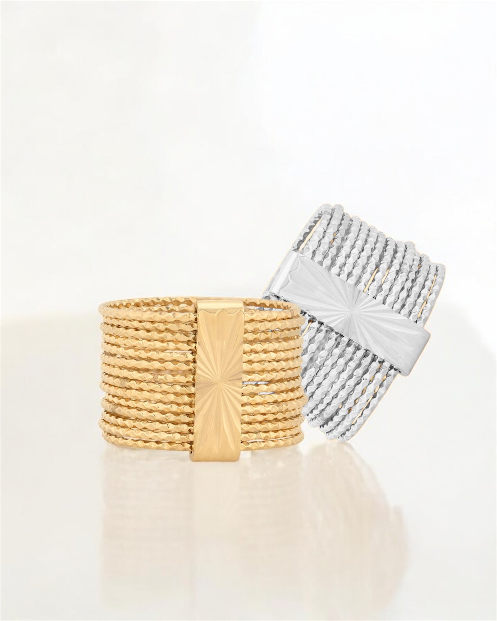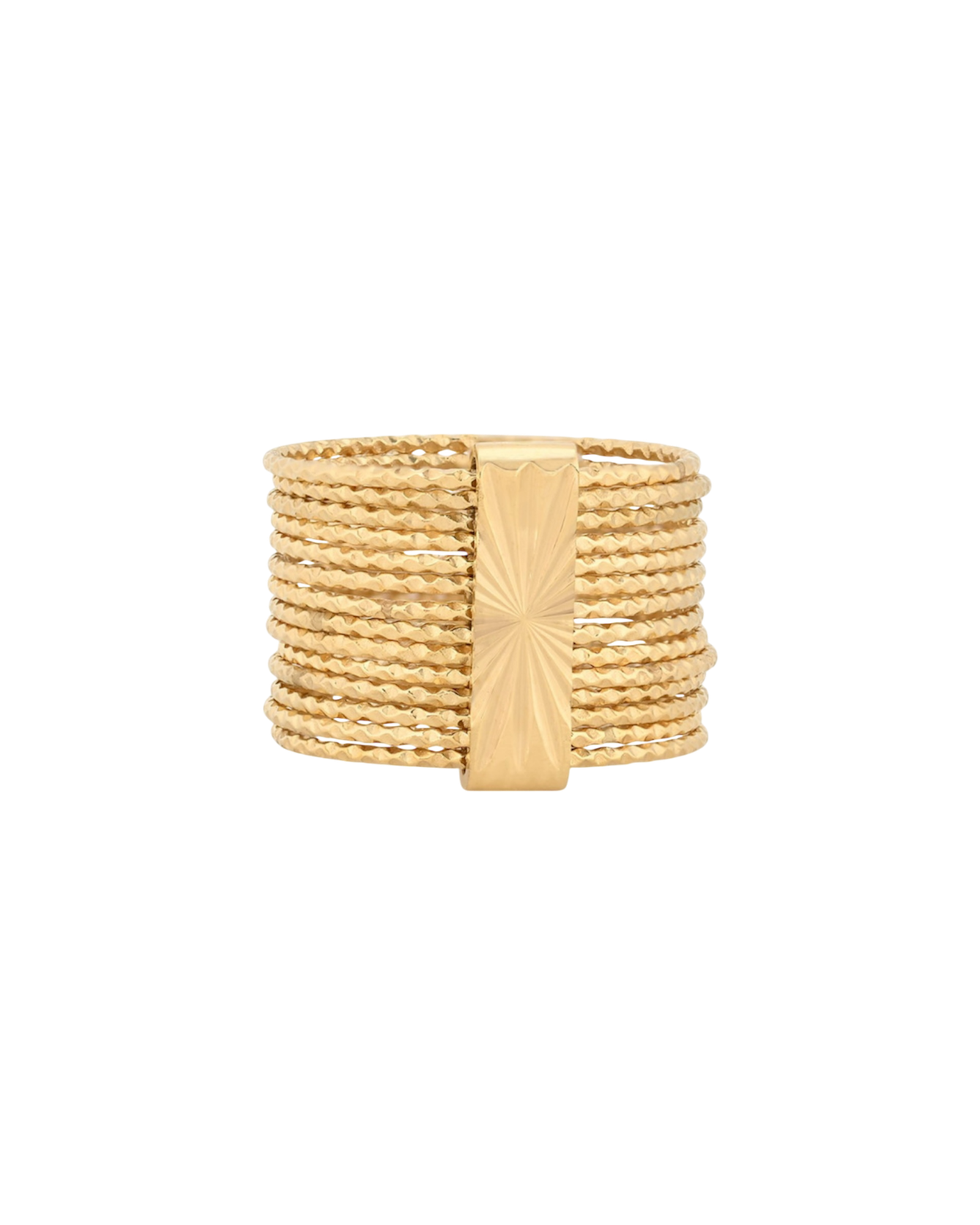 O Anel Tramas de Luz combina modernidade e sofisticação em cada detalhe. O seu design é composto por várias linhas entrelaçadas que criam um efeito único de brilho e movimento, com uma placa central texturizada que adiciona destaque e elegância.
