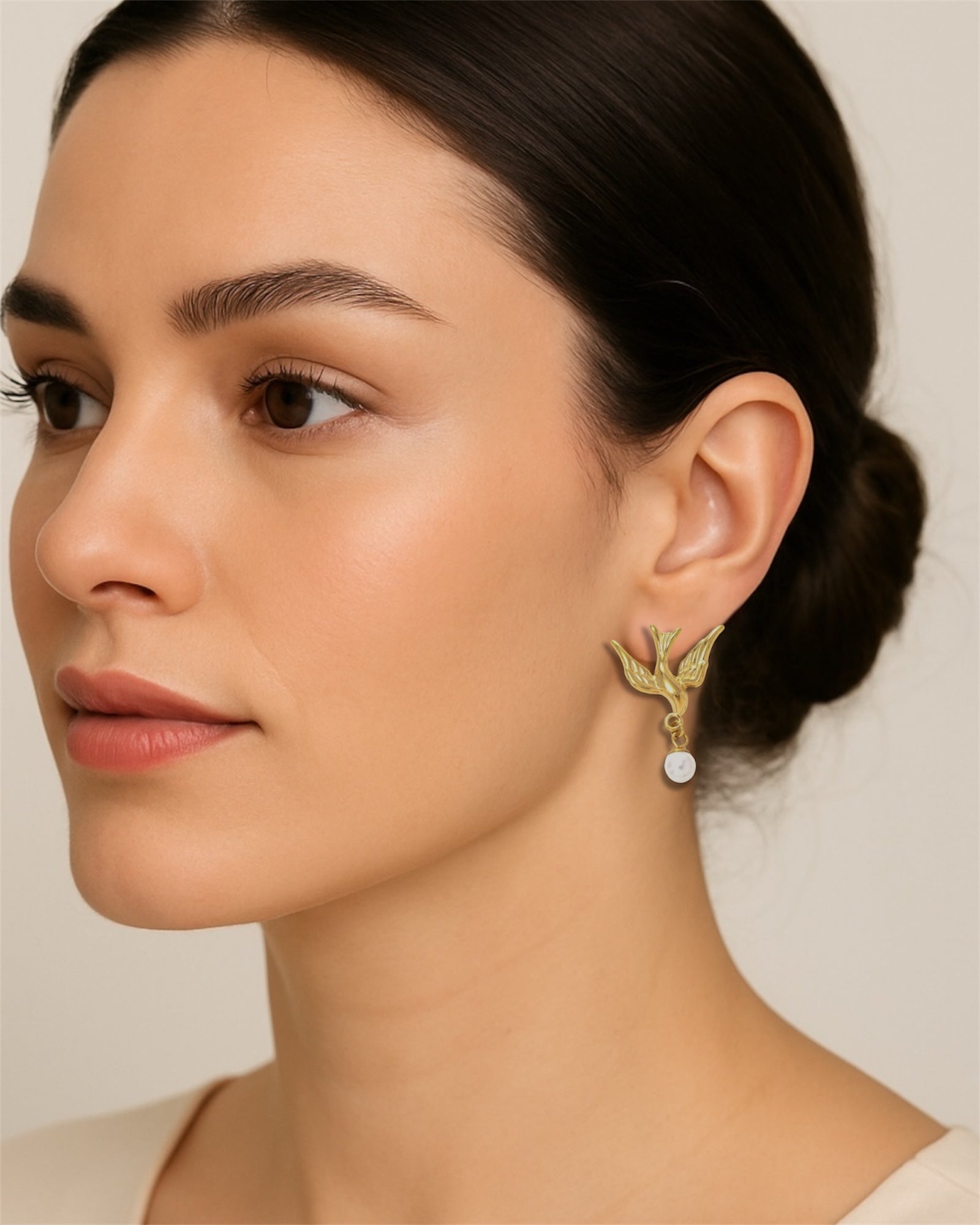 Os brincos Alma Livre celebram a liberdade e a leveza da alma com a delicadeza das andorinhas douradas. Cada peça é adornada com uma pequena pérola, trazendo um toque de pureza e feminilidade ao design. Uma joia que transmite poesia e movimento, perfeita para mulheres de espírito livre.