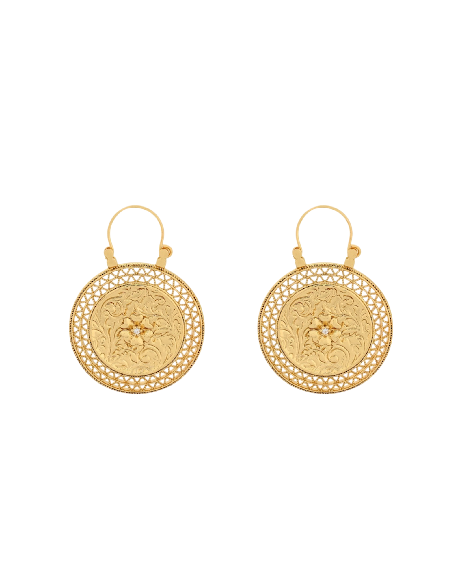 Os Brincos Flor de Tradição são uma verdadeira celebração da ourivesaria portuguesa. Com formato redondo em filigrana dourada, apresentam no centro um delicado motivo floral em relevo, símbolo de feminilidade e beleza intemporal .