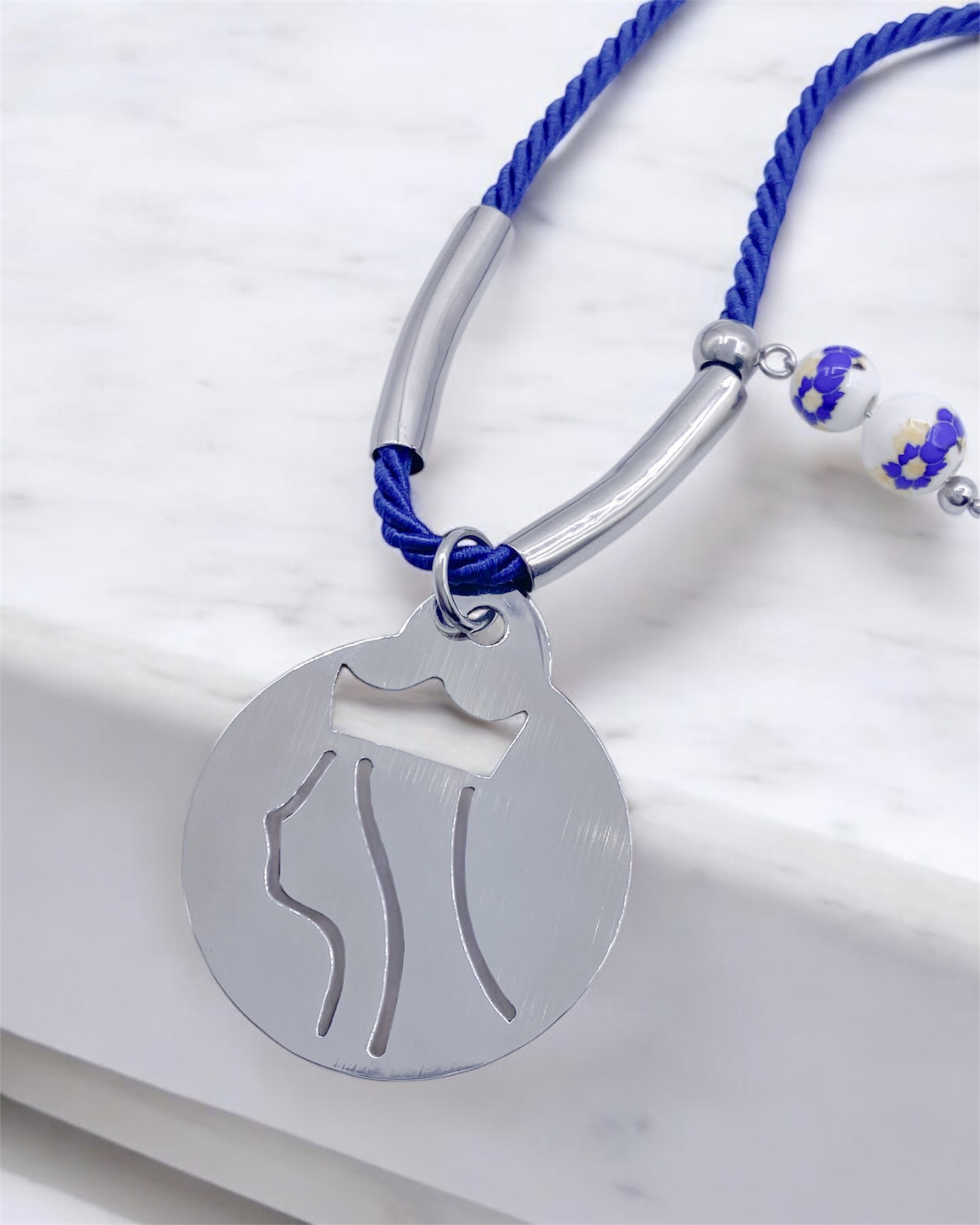 Inspirado na alma e tradição da cidade de Coimbra, este colar é um símbolo de identidade. Com um fio de seda entrelaçado azul profundo que evoca o rio Mondego, uma conta de porcelana pintada à mão com motivos cerâmica de Coimbra, e uma medalha prateada com o recorte estilizado da Rainha Santa Isabel, esta peça une história, arte e devoção.