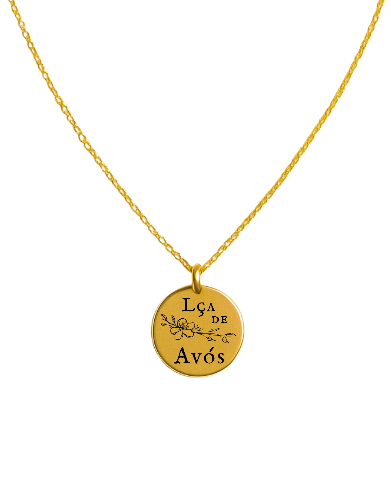 Este colar em aço inoxidável dourado apresenta um pendente redondo delicadamente gravado com as opções “Avó”, “Avô” ou “Avós”, acompanhado de um detalhe floral elegante. Uma joia pensada para transmitir carinho, gratidão e memória afetiva em cada detalhe.