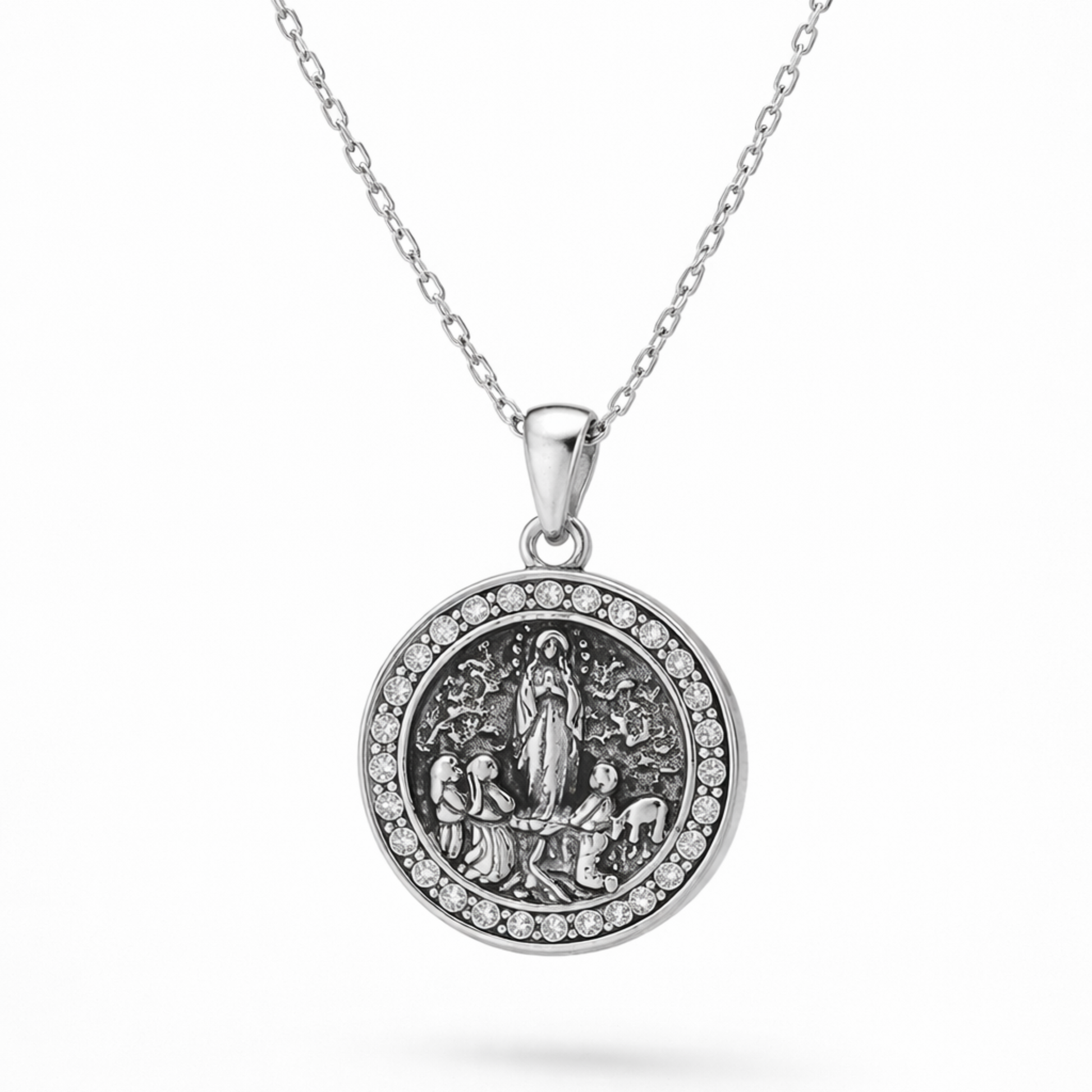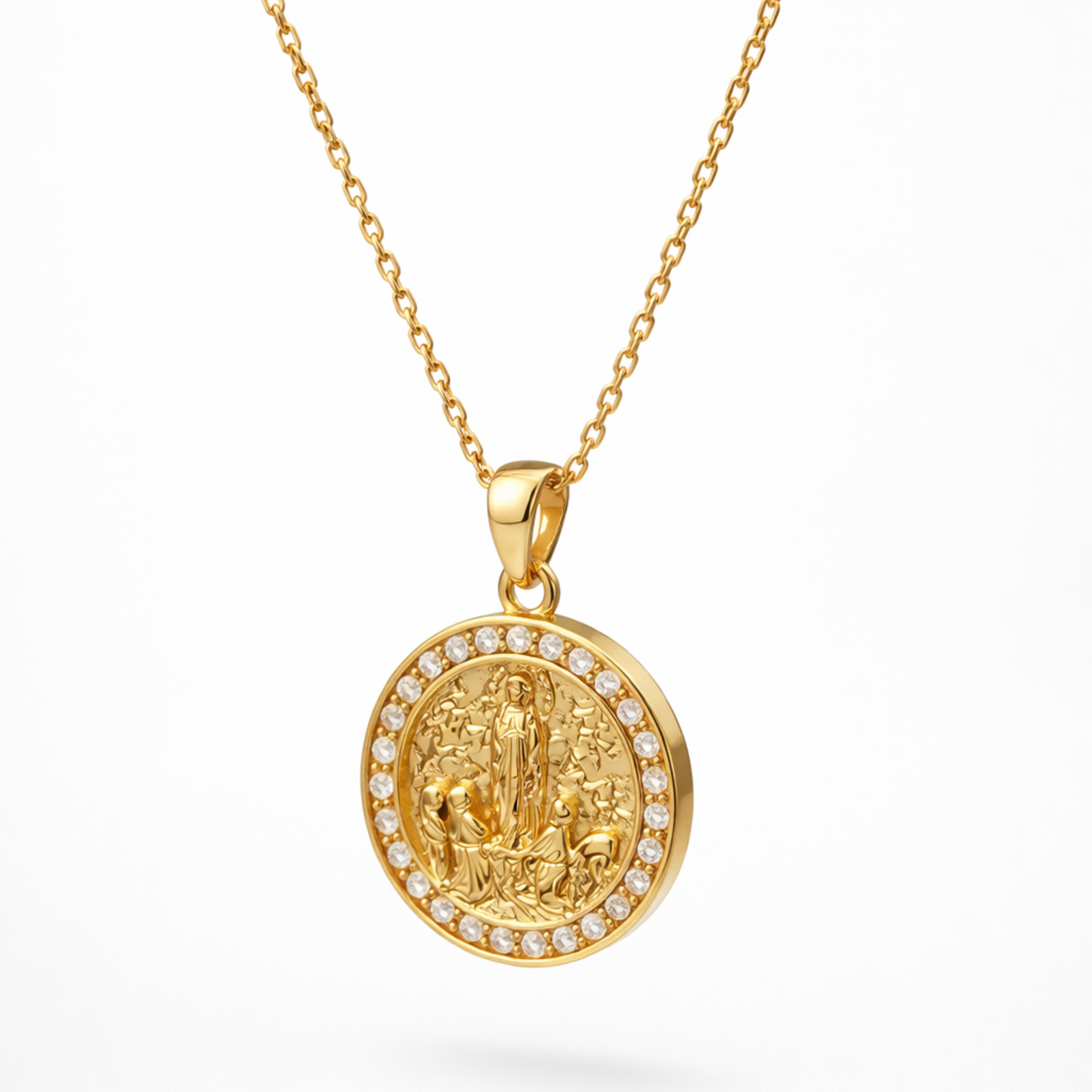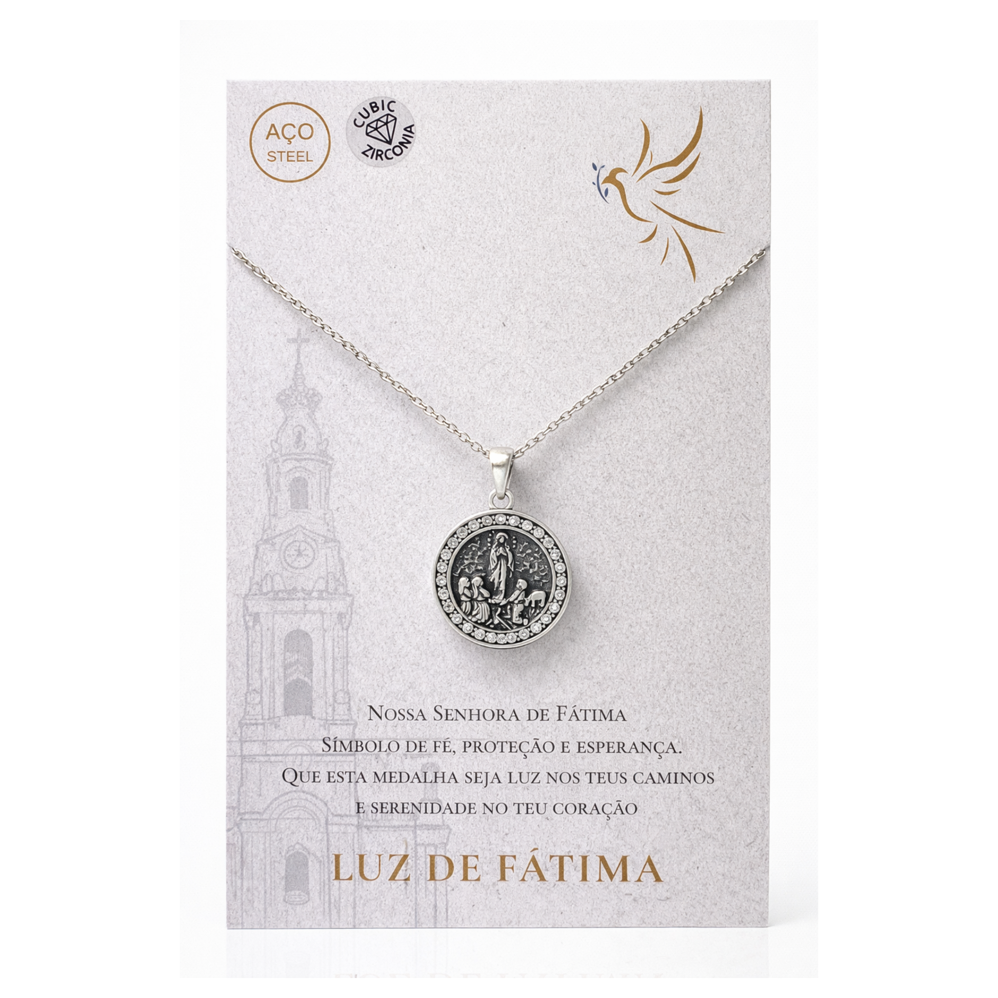 O Colar Luz de Fátima apresenta uma medalha ricamente detalhada com a imagem de Nossa Senhora de Fátima acompanhada pelos três pastorinhos, símbolo eterno de devoção e esperança.