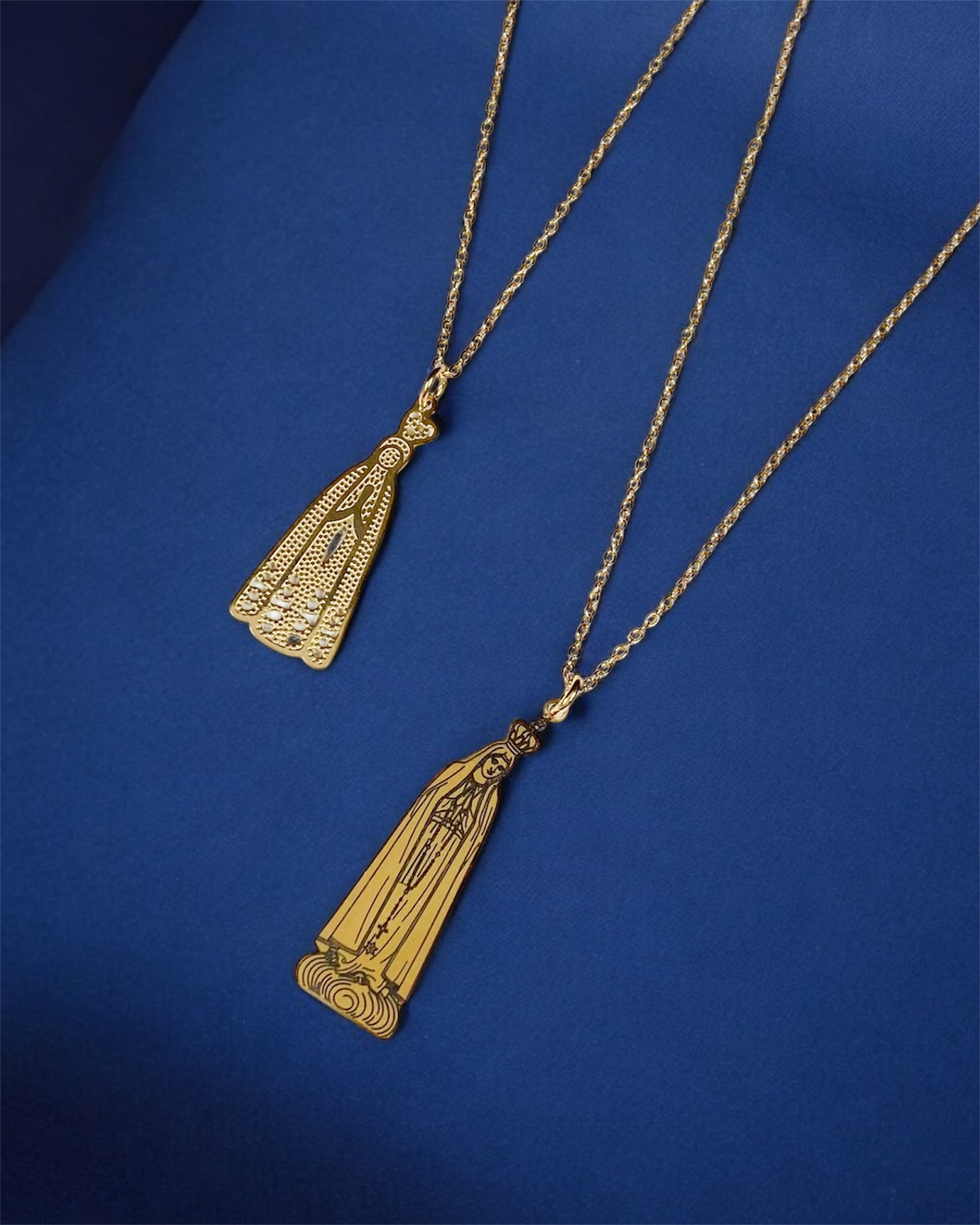 O pendente apresenta um design minimalista e contemporâneo, com traços finos que representam a figura de Nossa Senhora de Fátima de forma elegante e simbólica.