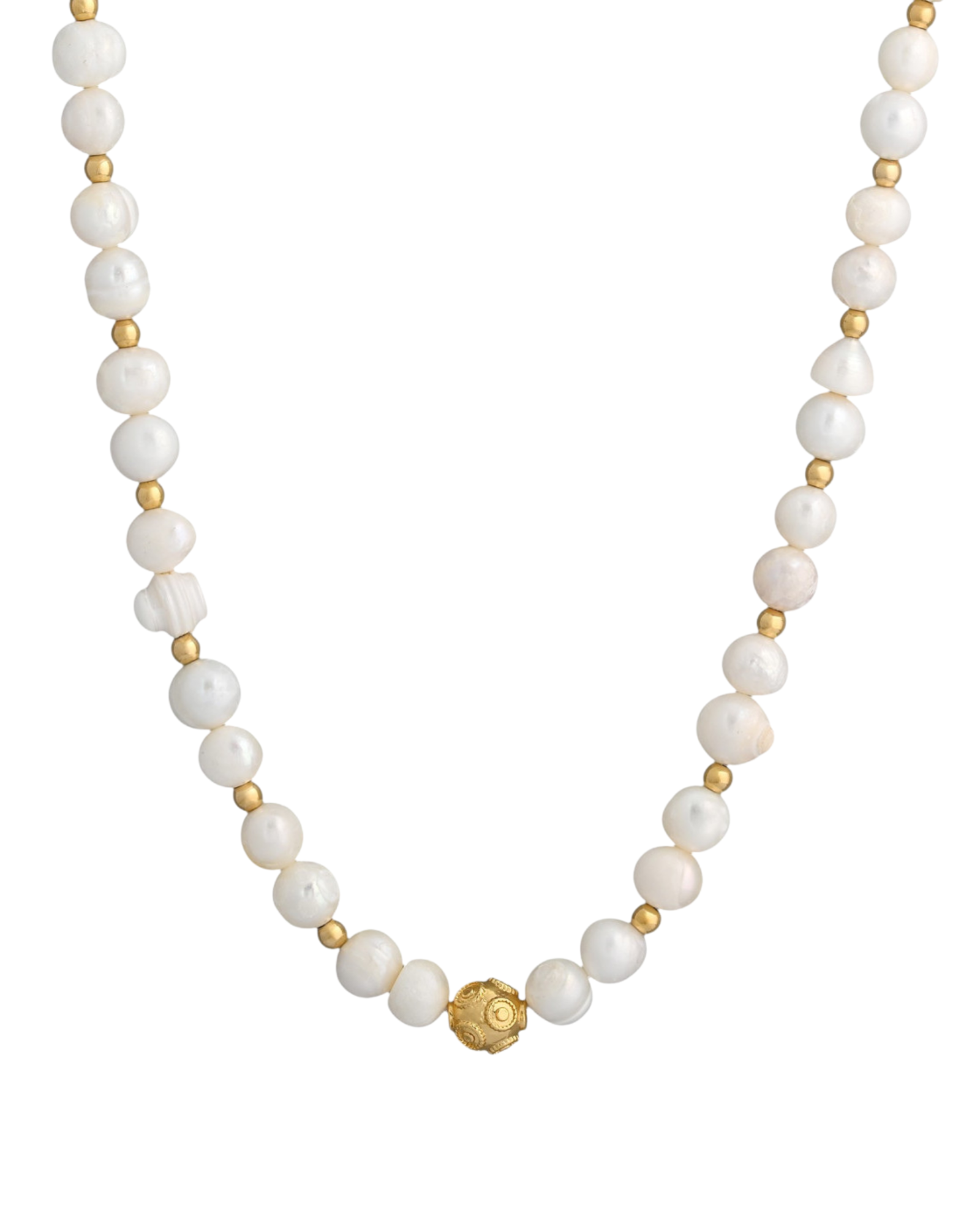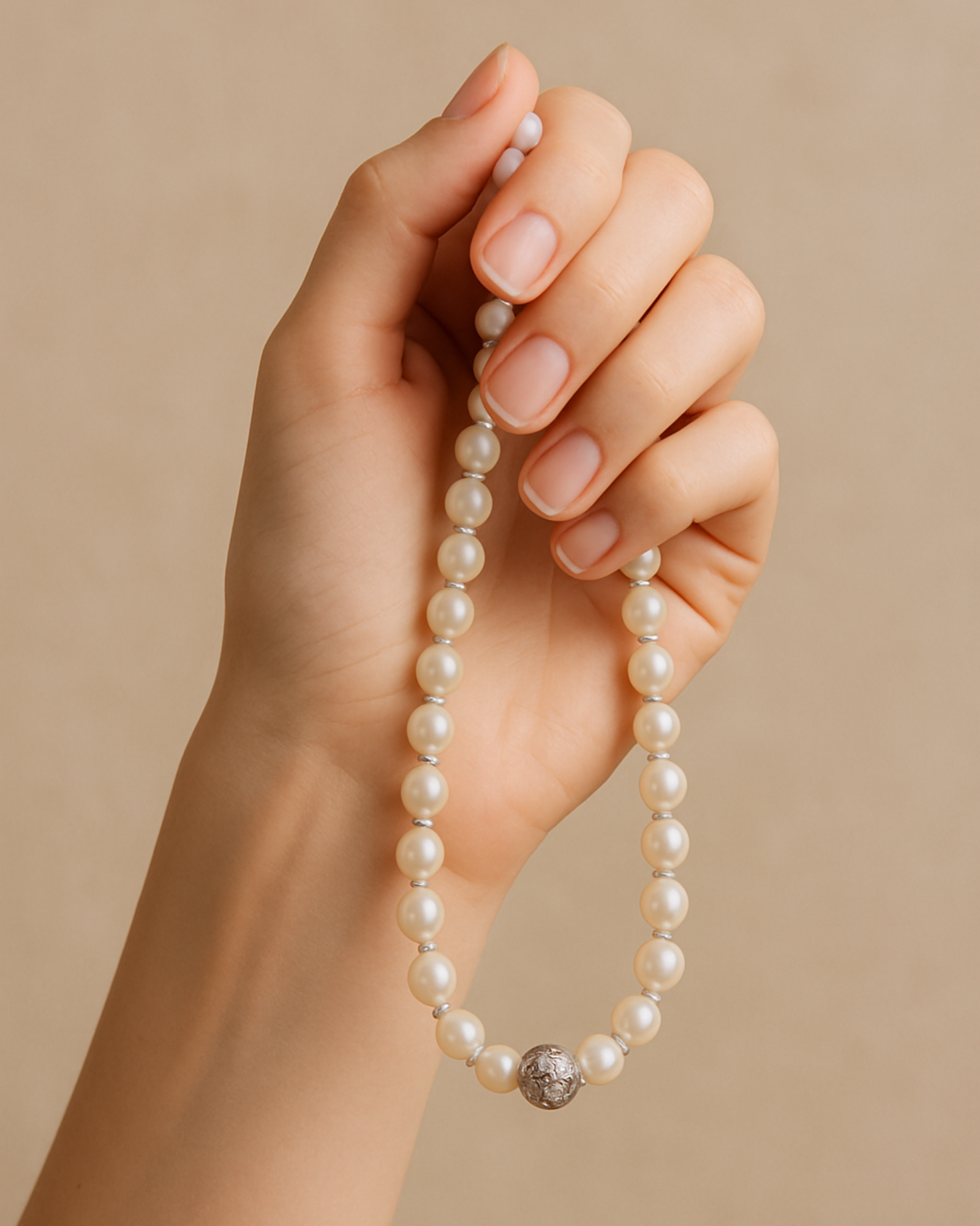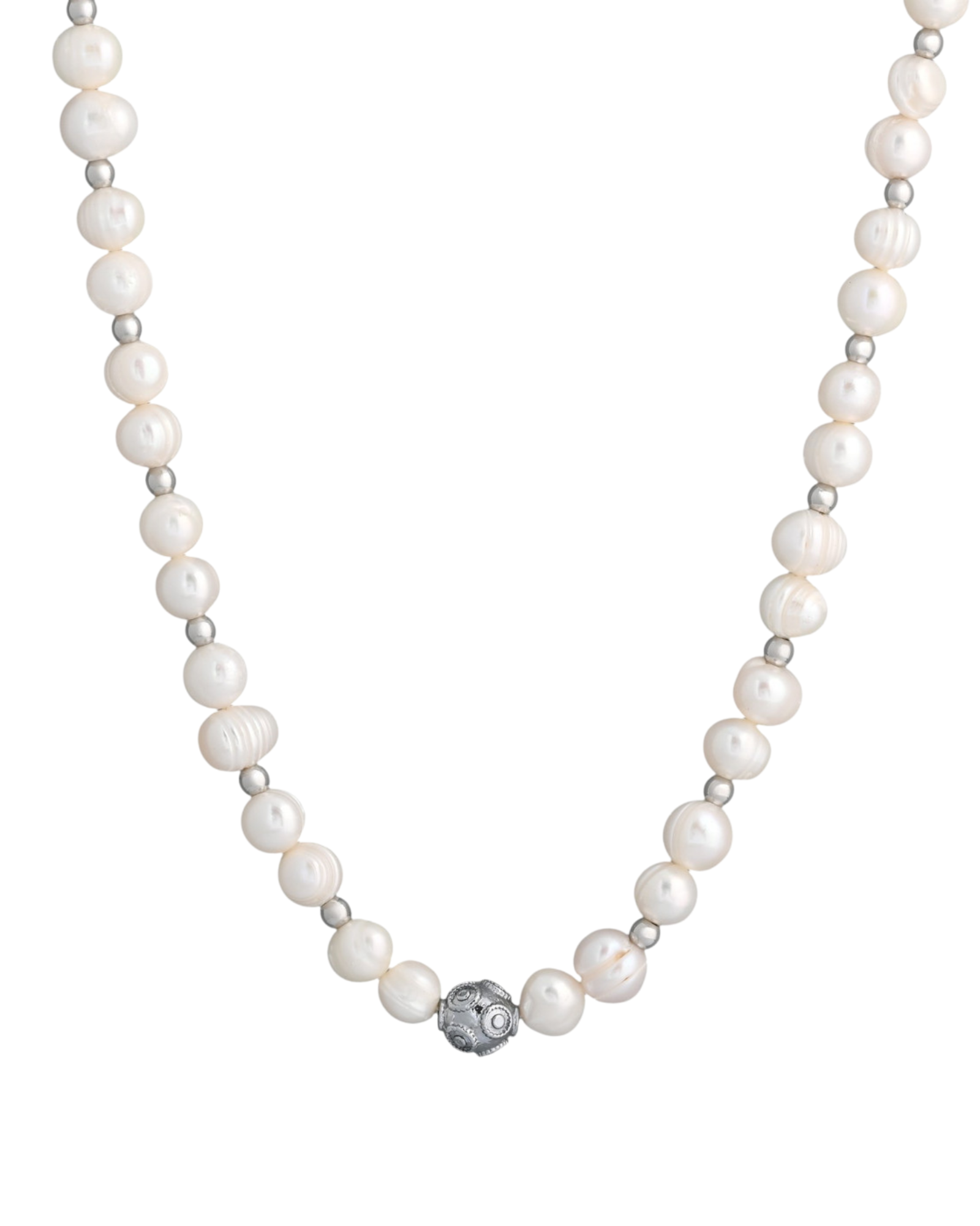 Este colar combina pérolas naturais de brilho suave com pequenas esferas prateadas, destacando ao centro a emblemática Conta de Viana , símbolo da ourivesaria portuguesa. Uma peça sofisticada que valoriza a cultura e acrescenta charme a qualquer ocasião.