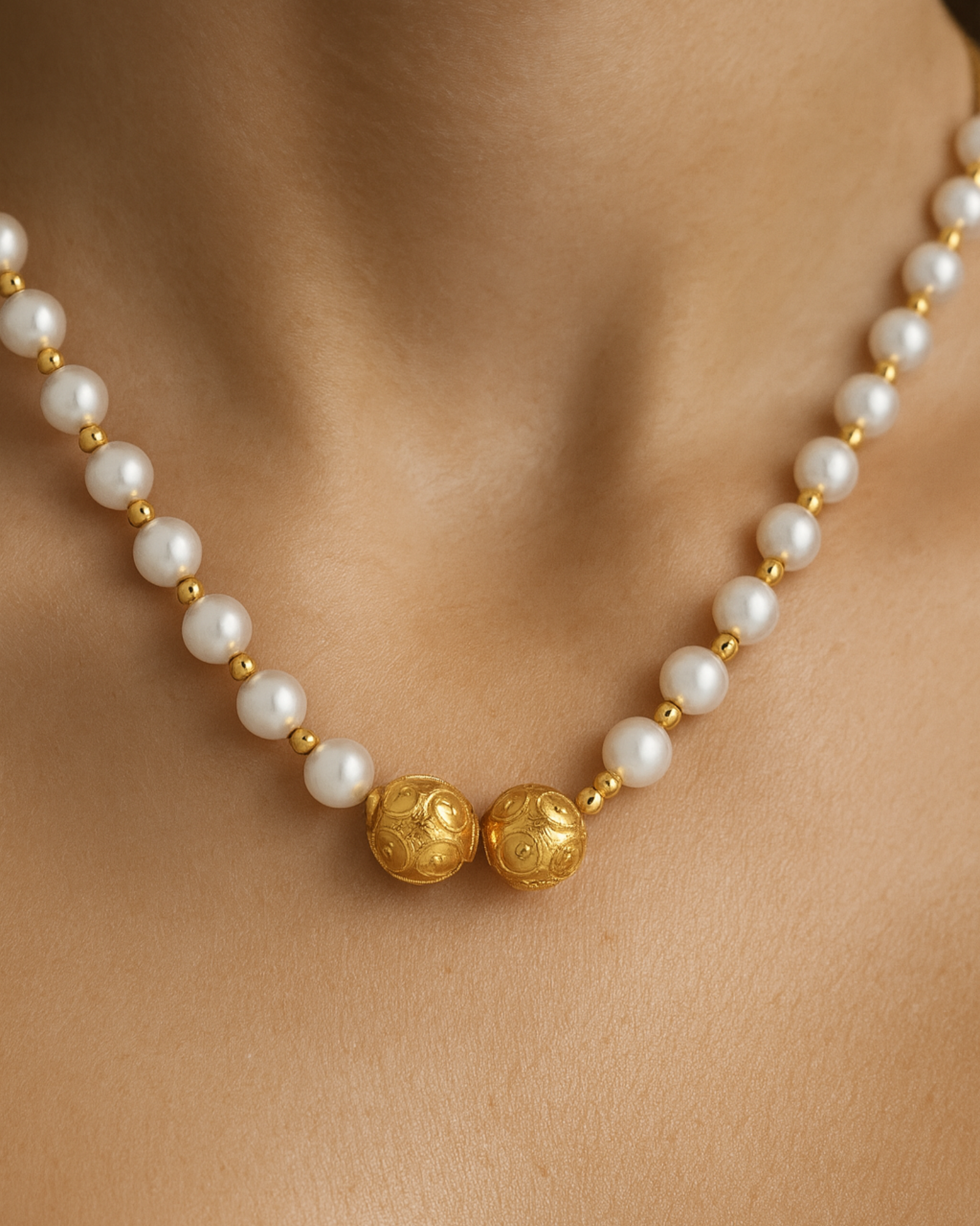 Este elegante colar combina a delicadeza das pérolas com o brilho das contas douradas, criando um contraste refinado e intemporal. As duas contas centrais em dourado trazem um detalhe especial que valoriza ainda mais o design. Perfeito para ocasiões formais ou para dar um toque sofisticado ao dia a dia.