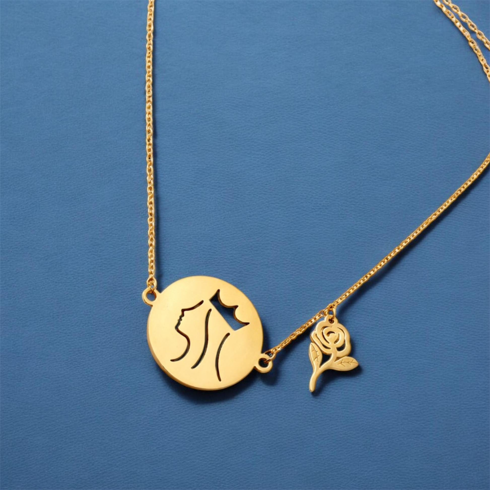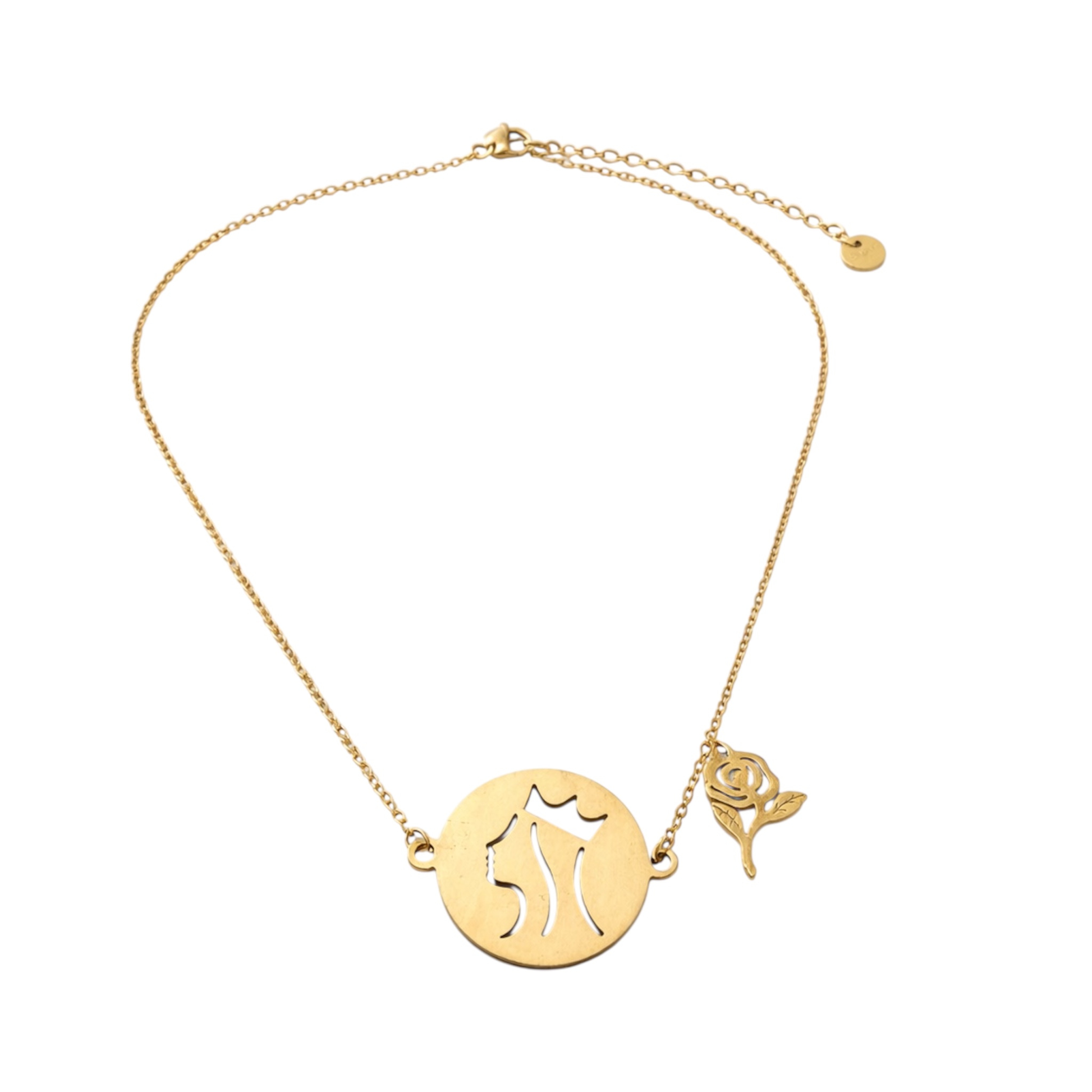 O delicado pendente em forma de rosa acrescenta um toque romântico à peça, evocando a lenda das rosas e reforçando o seu significado histórico e espiritual.