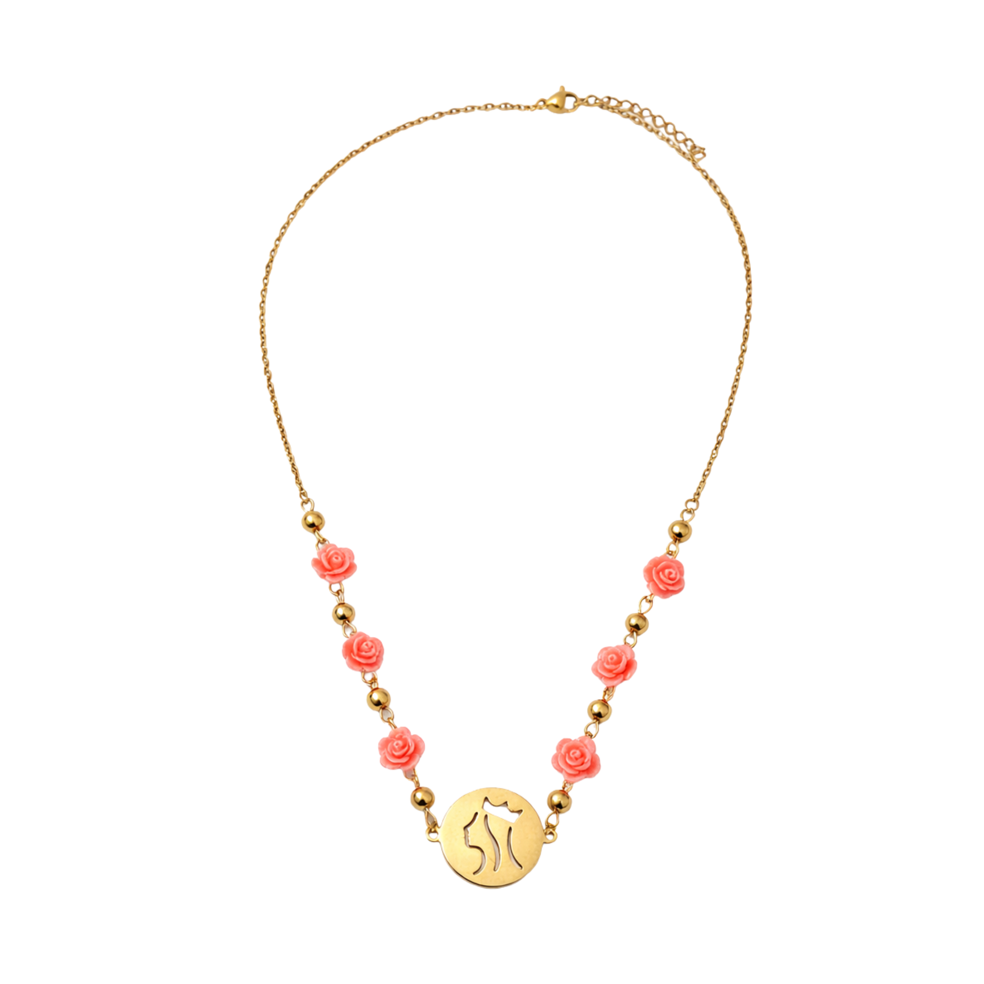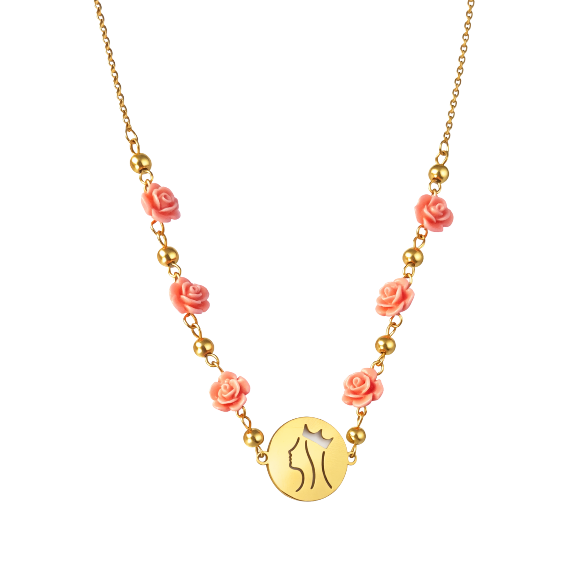 A medalha dourada apresenta o perfil minimalista da Rainha, símbolo de proteção e devoção. Ao longo da corrente, pequenas rosas em tom blush evocam o famoso milagre que marcou a sua história, um gesto de amor transformado em flor.