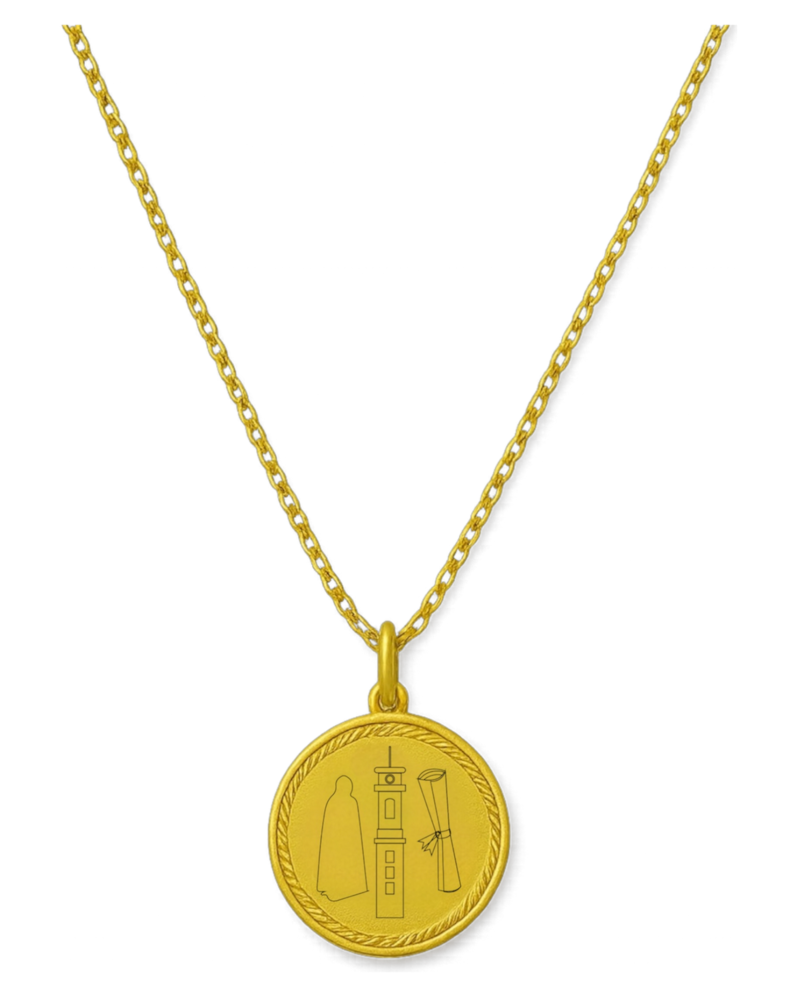Celebre conquistas, memórias e a jornada do conhecimento com o vivi Coimbra. A medalha redonda exibe três ícones marcantes: a capa dos estudantes, a torre (símbolo de sabedoria e vigilância) e o diploma — uma homenagem elegante à vida académica, ao esforço e à superação.