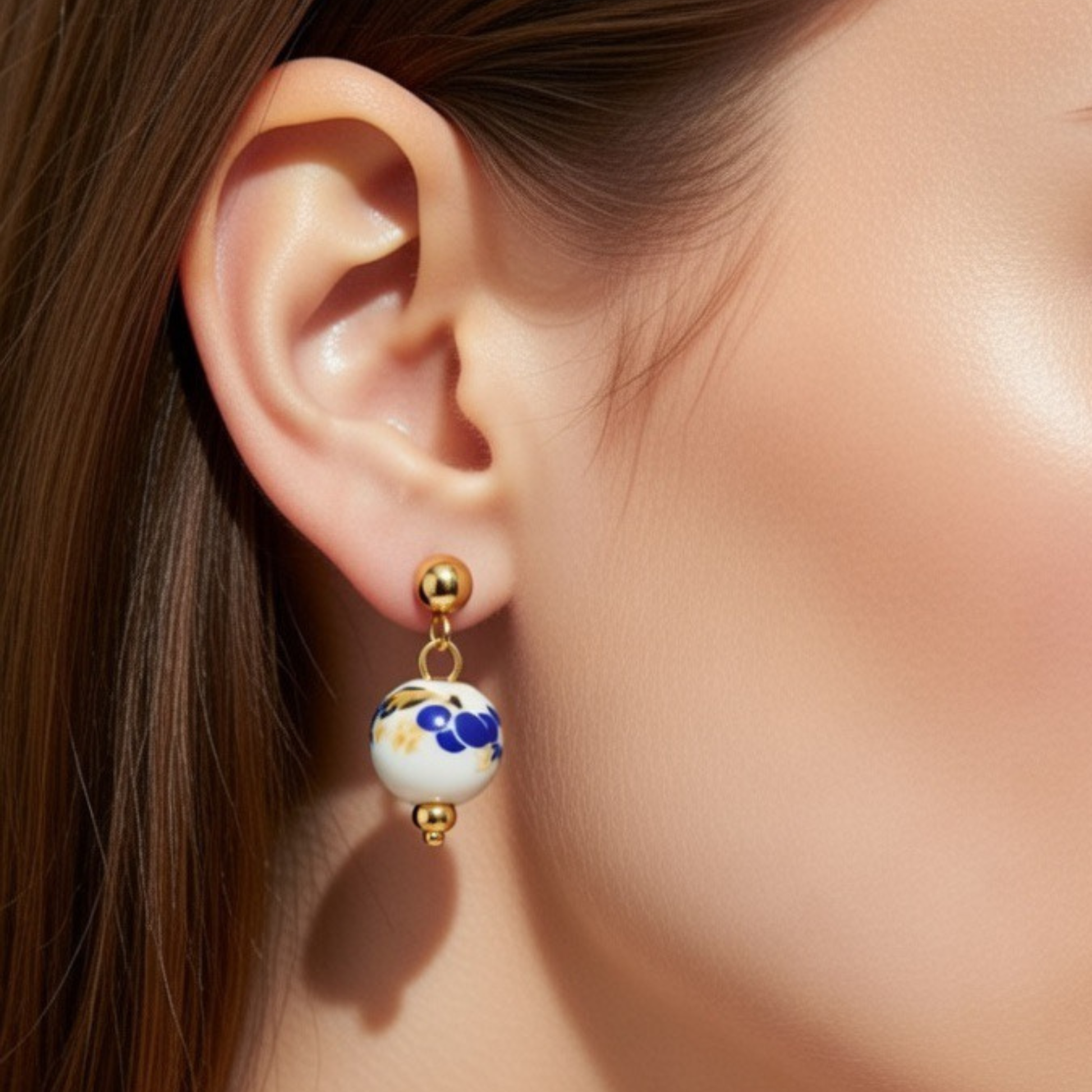 - Conta de porcelana artesanal, com pintura floral em azul e dourado