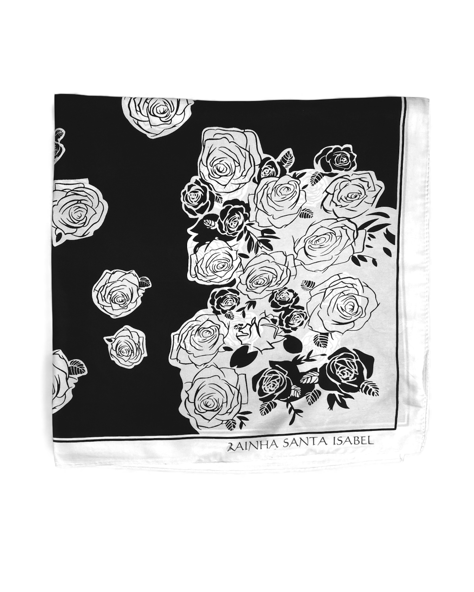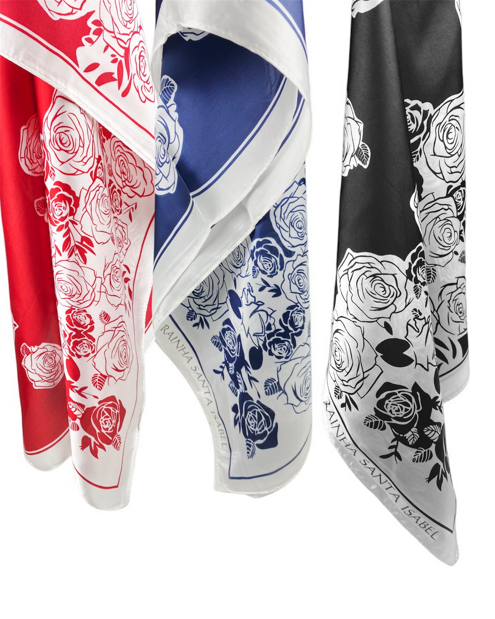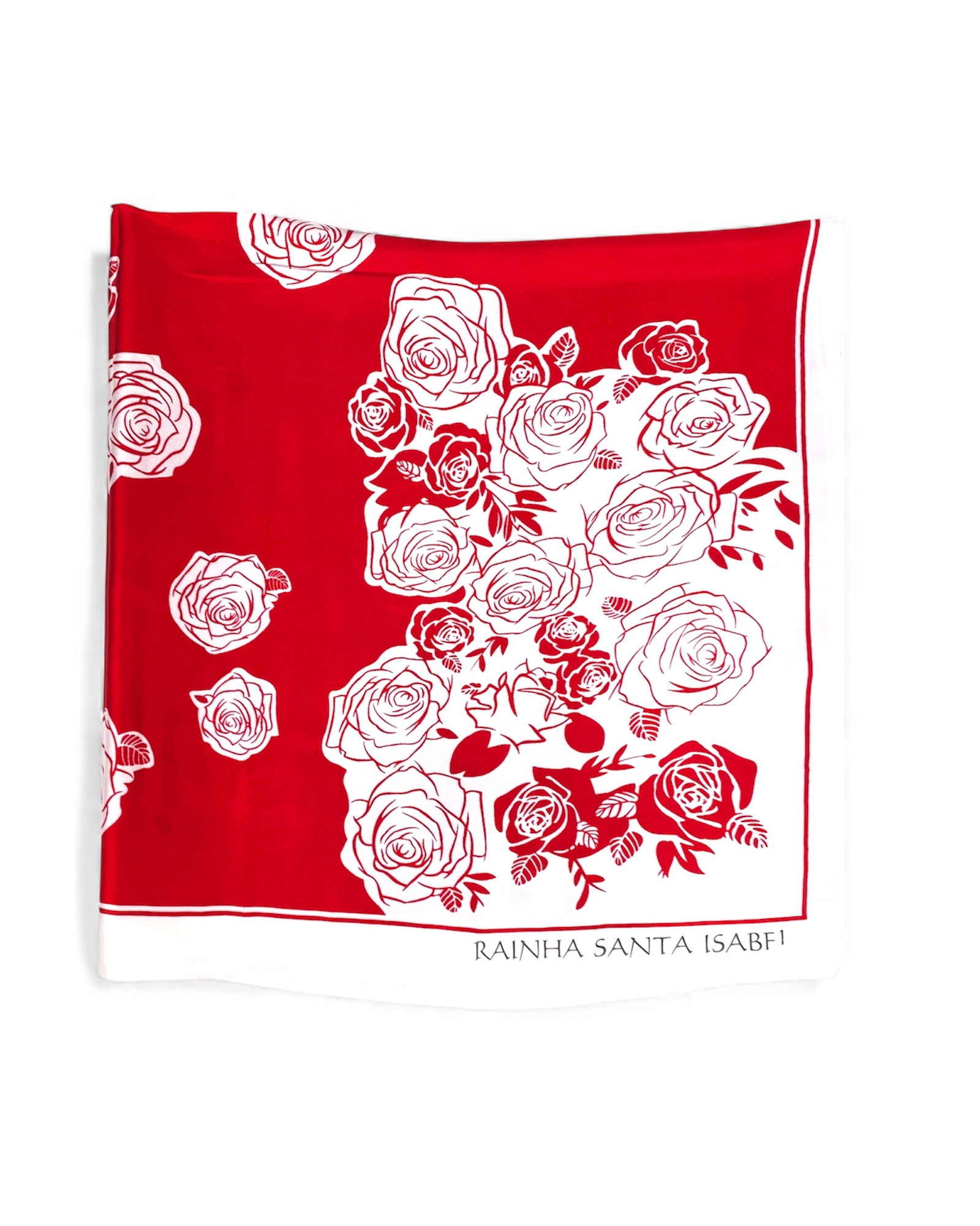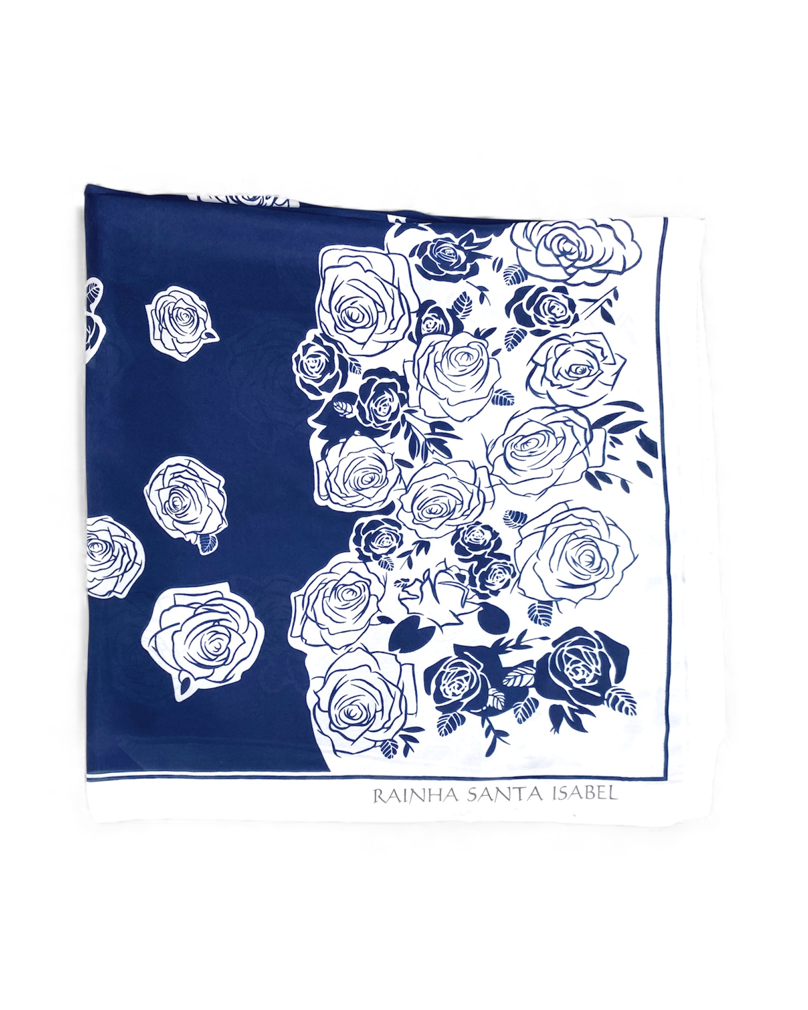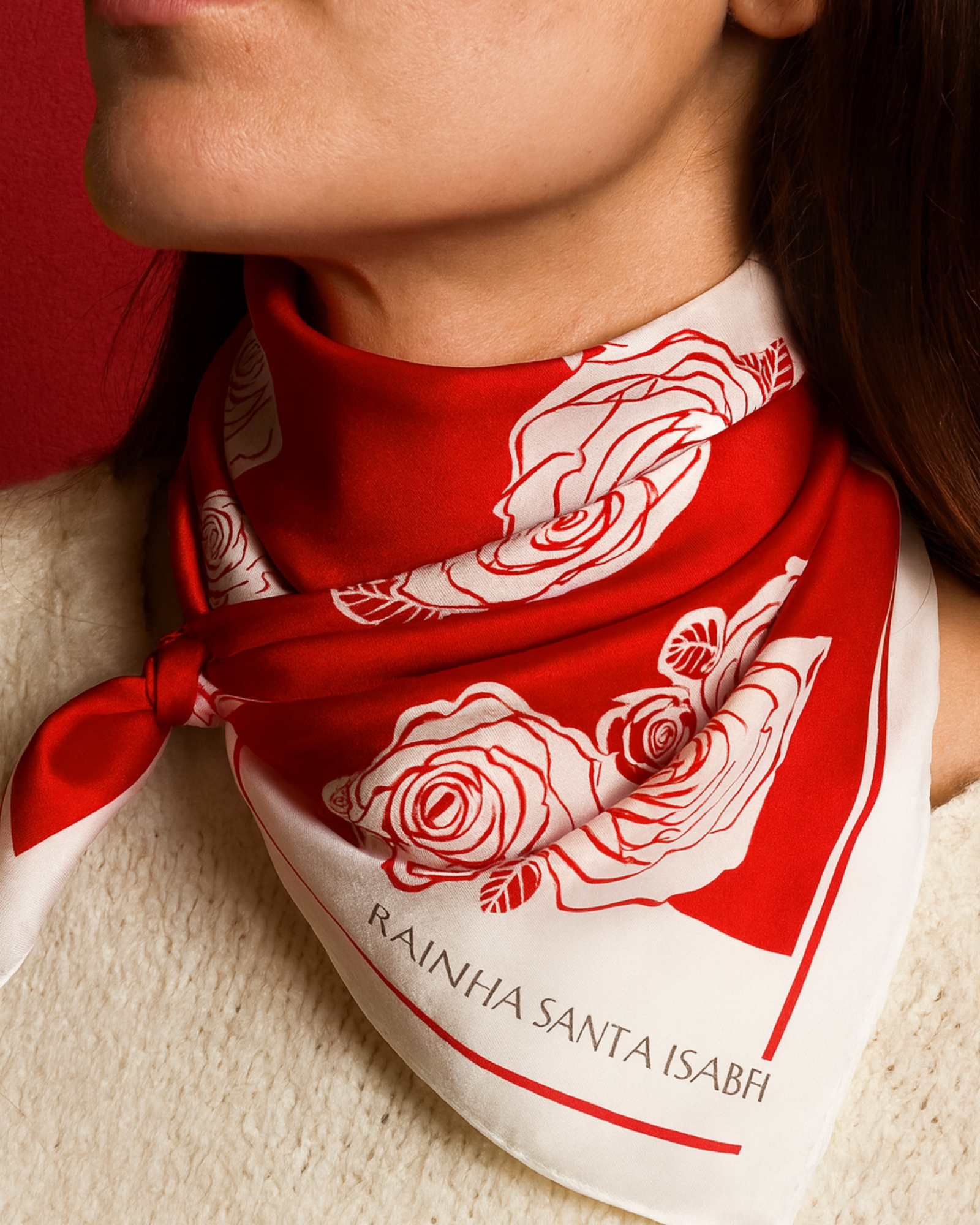 Envolva-se em elegância e significado com o lenço da Coleção Rainha Santa Isabel, inspirado na figura marcante da Rainha Santa e no milagre das rosas.