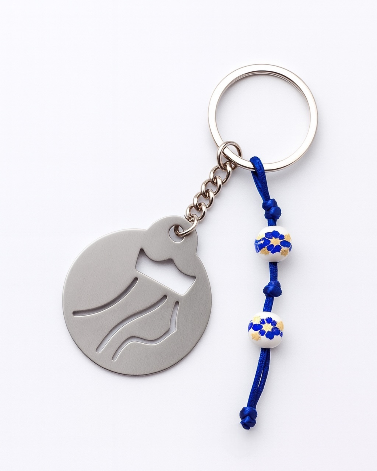 Inspirado nas cores e na tradição da cidade, o porta-chaves Coimbrinha combina o azul da cerâmica de Coimbra com o brilho do aço prateado, criando uma peça que une história e modernidade.